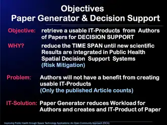 - (Risk Management) Disaster occur in space and time. They challenge the risk management organisations with unexpected requirements and constraints. Dynamic document generation can be used to support risk management team with short and very comprehensive documents that include