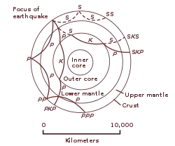 "Reconstruction of seismic reflections in the deep interior indicate some major discontinuities in seismic velocities that demarcate the major zones of the Earth: inner core, outer core, mantle, lithosphere and crust."[2]