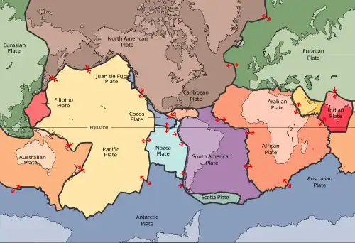 "In geologic terms, a plate is a large, rigid slab of solid rock. The word tectonics comes from the Greek root "to build." Putting these two words together, we get the term plate tectonics, which refers to how the Earth's surface is built of plates. The theory of plate tectonics states that the Earth's outermost layer is fragmented into a dozen or more large and small plates that are moving relative to one another as they ride atop hotter, more mobile material."[3]
