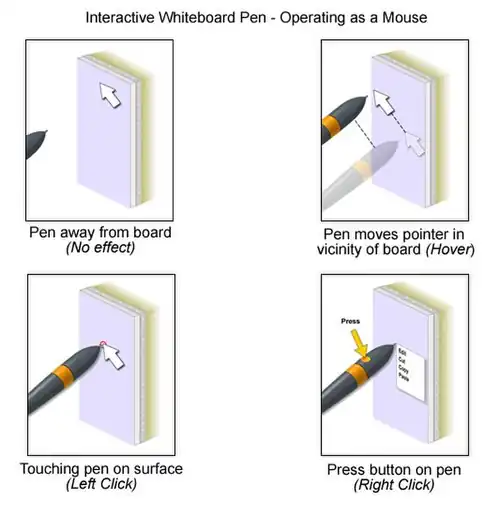 | Operation of an electromagnetic pen-based interactive whiteboard | An electromagnetic pen-based interactive whiteboard involves an array of wires embedded behind the solid board surface that interacts with a coil in the stylus tip to determine the horizontal and vertical coordinates of the stylus. The pen itself usually is passive, i.e., it contains no batteries or other power source; it alters the electrical signals produced by the board. For instance, when close to the surface of the board, the mouse pointer can be sensed, giving the board "mouse-over" capabilities. When it is pressed in against the board in one way, the board activates a switch in the pen to signal a mouse click to the computer; pressed in another way, contact with the board signals a click of the right mouse-button. Like a scaled-up version of a graphics tablet used by professional digital artists and designers, an electromagnetic IWB can emulate mouse actions accurately, will not malfunction if a user leans on the board, and can potentially handle multiple inputs. |
