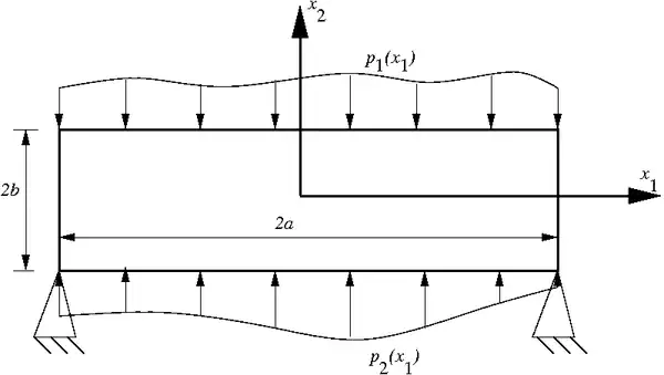 {\displaystyle {\begin{aligned}\sigma _{12}&=0~;~~x_{2}=\pm b\\\sigma _{22}&=-p_{1}(x_{1})~;~~x_{2}=b\\\sigma _{22}&=-p_{2}(x_{1})~;~~x_{2}=-b\\\sigma _{11}&=0~;~~x_{1}=\pm a\end{aligned}}}