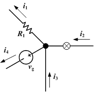 We observe four currents "entering" the junction depicted as the bold black dot in Figure 6.1. Of course, two currents are actually exiting the junction , but for the purposes of circuit analysis it is generally less restrictive to consider what are in actuality positive currents flowing out of a junction to be negative currents flowing into that junction (mathematically the same thing). Doing so allows us to write Kirchhoff's law for this example as: