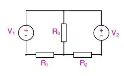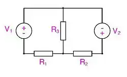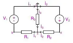 Part 3It may not be clear at this point why we insist on thinking of negative currents flowing into a junction instead of positive currents flowing out. But note that Figure 6.1 provides us with more information that we generally can expect to get when analysing circuits, namely the helpful arrows indicating the direction of current flow. If we don't have such assistance, we generally should not pass judgment on the direction of current flow (i.e., placing a negative sign before our current variable) until we calculate it, lest we confuse ourselves and make mistakes. Nevertheless in this case we have the extra information of directional arrows in Figure 6.1, so we should take advantage of it. We know that currents i2 and i3 flow into the junction and the currents i1 and i4 flow out. Thus we can write Kirchhoff's Current Law as written is only applicable to steady-state current flow (i.e., no alternating current, no signal transmission). It can be extended to include time-dependent current flow, but that is beyond the scope of this section. Kirchhoff's Current Law is used in a method of circuit analysis referred to as nodal analysis to be discussed in Lecture 7. A node is a section of a circuit where there is no change in voltage (where there are no components, wire is often assumed to be perfectly conductive). Each node is used to form an equation, and the equations are then solved simultaneously, giving the voltages at each node.