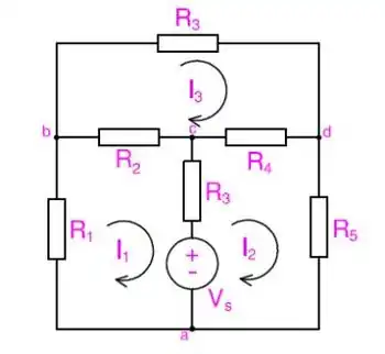 {\displaystyle (I_{2}-I_{1})*R_{3}+(I_{2}-I_{3})*R_{4}+I_{2}*R_{5}=V_{s}}