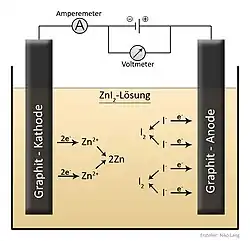 | Picture of a zinc iodide containg electrochemical cell. The text is german: Lösung = solution Graphit=Carbon |