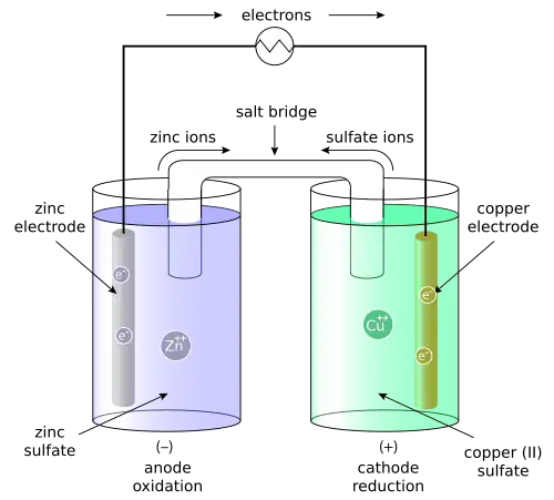 a Daniell cell consists of a zinc anode (an electron collector), is oxidized as it dissolves into a zinc sulfate solution, the dissolving zinc leaving behind its electrons in the electrode according to the oxidation reaction (s = solid electrode; aq = aqueous solution):