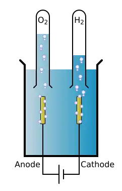The basic apparatus used in electrolysis is shown on the right. It conists of a voltage source, leads, two electrodes and a container with the substance to be electrolysed, in this case: a beaker glass with water. The beaker glass with its content is referred to as: electrochemical cel[1]. The part of the leads immerged in the solution are called "electrodes". In the electrolysis of water these electrodes are made of platinum. The voltage source in general is adjusted to a few volts.