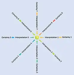 Consider the illustration to the right. In the center is some ambiguous information, such as the rabbit-duck image. Several equally accurate interpretations are possible; it might be a duck, or it might be a rabbit. An error can occur, however, when one of many possible interpretations is chosen as the one correct interpretation and is asserted as a certainty. Closure has been gained at the expense of accuracy, exploration, and possibility. This is the mechanism of ideology, and the basis for polarizing beliefs. If we can unwind this error, we can find common ground.