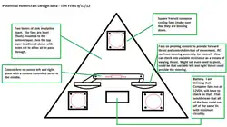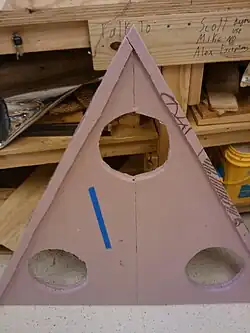 A small-scale prototype of the craft was built to gain insight into the project's scale and construction method. This prototype revealed that the scale of the craft was going to be much larger than initially suspected in order to accomodate the span of the fan propellers. The main craft body was constructed out of 0.75" thick pink insulation foam. It was made from four triangular pieces that formed a 46" equilateral triangle, and was two sheets thick (1.5"). 8.5" holes were cut at the three corners as ducts for three fans, and the top edges of the craft body were beveled to decrease drag on take-off.