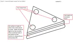 -Use the same body -Attach a cushion to the bottom, I am thinking clear plastic tarp or mylar balloon for the material. Mylar would be lighter, but probably less durable. -Test first with it just wired, then simulate battery and control mechanism load. -If test data seems positive, refine. Ideally the final design will not use an air-cushion, so move on to step 3: