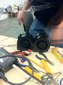 We built directional motors, added an on and off switch and a place to place the battery that is centered to keep balance and does not affect airflow. Then we changed it. With the help of my dad, I got the idea of how to make a light-weight power supply. I synchronized 2 nine-vault batteries to make a power supply with 18 volts to power the 12 vault air. Testing it could've been risky, cause it had the possibility of damaging the motor, but when we make a permanent power supply, I will combine a nine-vault with triple or double A batteries to get a more accurate voltage