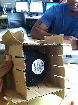 We are currently attempting to find a power source for our fans. Myles fan had 4 D batteries, and although it pushed a ton of air, it weighed a lot. We then managed to find a 12V RC battery pack, and charged it. Once charged we hooked it up to one of the air pump fans (12V) and it worked beautifully. The amount of air pushed out by that one fan was incredible, and we had three more for a total of four. We decided that we would use two battery packs to power the four fans, as one batter pack was enough to power them a solid amount, and any more could potentially be too heavy. Our conclusion is that we will use the four air pump fans to lift the hovercraft off the ground, and our "directional fan" to guide it along in the back.