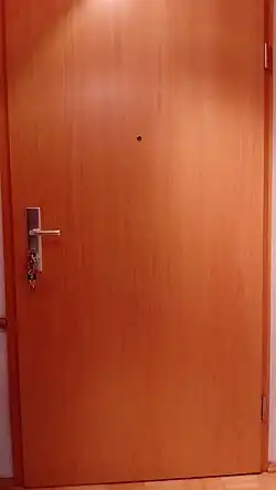The full angle of view is . If the distance to the object (e.g. a door) and the width of the door are known, then the angle of view can be calculated in the following way: