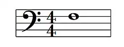 In bass clef, this is a F and is fingered using the open fingering (no valves pressed). To play this note, first play it on a piano and match the pitch with your voice and then attempt matching that pitch with your instrument.