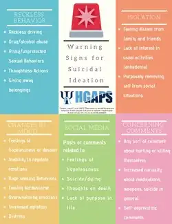 Here is an infographic describing 5 mental health first aid steps on how to assess for risks, listen non-judgmentally, encourage professional help and self-help: Helping Someone At Risk[6][7]Here is an infographic describing common warning signs for people experiencing suicidal ideation: Warning Signs for Suicidal Ideation