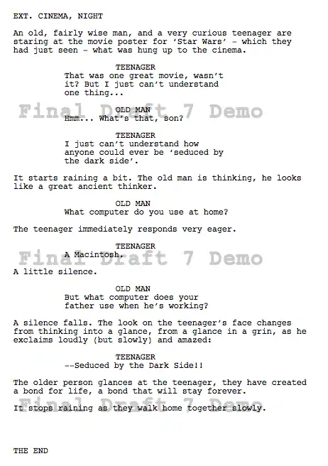 Therefore, you must look at real motion picture scripts and see what you are doing wrong.