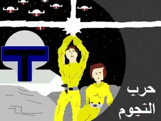 The text means "Star Wars", and it’s pronounced “Harb El Nojoom” in Arabic language. And in Egyptian accent, it is pronounced as “Harb El Nogoom”, the “G” as in “Game”. 30 points
