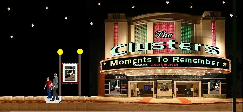 In this shot, the actors are standing in front of a very simple wall with a poster on it. To create an entire exterior of a motion picture theater, we will need a huge matte painting.