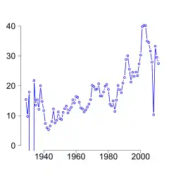 - ↑ This analysis is similar to Figure 10.1 in Reinhart and Rogoff (2009). For more details see the help file for "bankingCrises" in the Ecdat package available from the Comprehensive R Archive Network (CRAN).