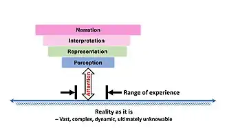 Although reality is our common ground, each of us has unique experiences of its vastness. Refer to the diagram on the right. Reality is vast, complex, and dynamic, and the range of experiences any of us has is a tiny fraction of reality as it is. Furthermore, within our range of experience, our attention is limited. Our attention concentrates awareness on some phenomena to the exclusion of other stimuli.[8] Because our concentration is selective and focuses on discrete information, whether subjectively or objectively, we exclude other stimuli present even within our range of experience.