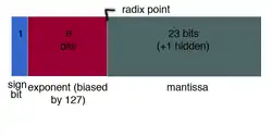 | "Middle" denormalized number | * | 0000 0000 | 100 0000 0000 0000 0000 0000 | ±2−1 × 2−126 = ±2−127 ≈ ±5.88 × 10-39 |