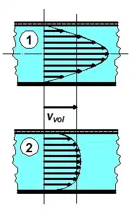 Velocity profiles for laminar (upper) and turbulent (lower) states at the same mass flow rate