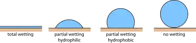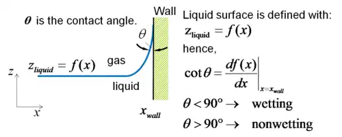 The contact angle is the angle between the liquid-solid and gas-liquid interfaces. It is calculated such that angle remains in the liquid. It is dependent on the adhesion forces between the liquid molecules and the solid wall. These forces are sensitive to the actual physicochemical conditions of the solid-liquid interface.