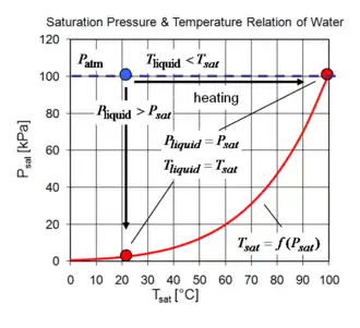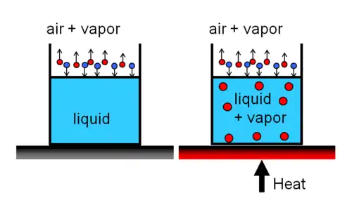 Evaporation occurs at the liquid gas interface. When the vapor pressure of liquid is less than the liquid's saturation pressure at the given liquid temperature, the evaporation and condensation occurs at the same time on the interface.At the liquid solid interface, at a given temperature, liquids starts to boil at saturation pressure.