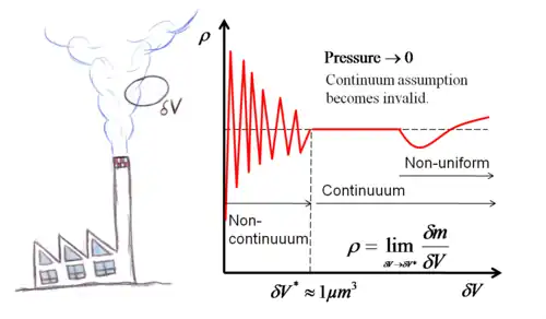 The molecules are not fixed in a lattice but move about freely relative to each other. Thus fluid density, or mass per unit volume, has no precise meaning because the number of molecules occupying a given volume continually changes. If the selected unit volume is smaller than the cube of the mean free path between the molecules, there will be large scatter in the determination of density, since the molecules move freely relative to each other, i.e. at one instant the number of molecules in the unit volume is not constant. This effect becomes unimportant if the unit volume is large compared with, say, the cube of the molecular spacing, when the number of molecules within the volume will remain nearly constant in spite of the enormous interchange of particles across the boundaries. In other words, when is selected such that the selected volume contains in average the number of molecules, the density converges to a level. The acceptable size of the unit volume for many liquids and gases is about . Over this value, the medium can be accepted as continuum , such that the variations in space and time can be accepted to be smooth and differential equations can be written to describe the fluid motion. If, however, the chosen unit volume is too large, there could be a noticeable variation within the selected volume owing to the non-uniform bulk distribution of molecules caused by temperature and/or pressure variations in the flow field.