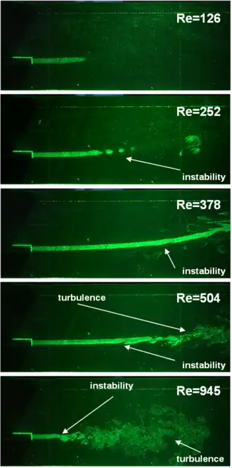 Laminar to turbulent transition occurs when the disturbances in the flow can not be damped anymore by viscous forces. This happens when the inertia of the flow is increased and/or the flow configuration (boundaries, states of the fluid(s)) causes the generation and/or amplification of very small disturbances. As Reynolds number (Re) is the ratio of the inertial forces to viscous forces, for different types of flows, over a critical Reynolds number, transition to turbulence takes place. Below a list of simple but still technically interesting flow cases and critical Reynolds numbers are listed: