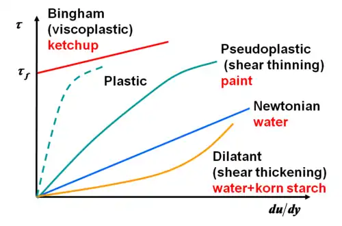 Fluids which do not follow the linear law between stress an the deformation rate are called non-newtonian and they are the subject of rheology. A dilatant (shear-thickening) fluid increases resistance with increasing applied stress. Alternately, a pseudoplastic (shear-thinning) fluid decreases resistance with increasing stress. If the thinning effect is very strong, the fluid is termed plastic. The limiting case of a plastic substance is one which requires a finite yield stress before it begins to flow. The linear-flow Bingham plastic idealization is shown in the figure, but the flow behavior after yield may also be nonlinear. Examples of a yielding fluid are toothpaste and ketchup, which will not flow out of the tube until a finite stress is applied by squeezing.
