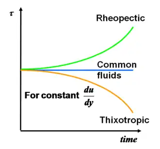 Some fluids show decreasing (thixotropic) or increasing resistance (rheopectic) in time for the same deformation rate. For example, pudding is a rheopectic fluid and some paints are thixotropic.