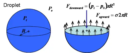 According to the above equation, in the soap bubble or in the droplet, inner pressure is higher than outer pressure. This can also be shown by a force balance. In the droplet, the force balance in the vertical direction reads