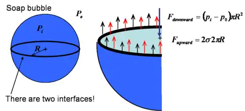 Note that owing to the two interfaces in the soap bubble force due to surface tension is as double as that in the droplet.