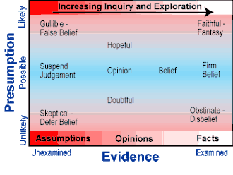 To determine the truth of a belief we assess the correspondence of this belief to reality. As we become more curious about the proposal, we can learn more about the evidence that supports or contradicts its accuracy. Our understanding of the evidence begins to increase as a result of our inquiry and exploration. As more and more information becomes available, we become better informed and create a more accurate understanding and assessment of the situation. This accumulation of evidence is plotted on the horizontal axis in the following diagram. It ranges from unexamined on the left to examined on the right.