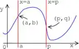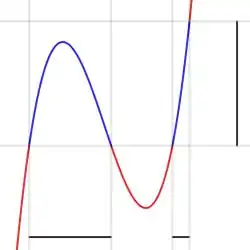 This is illustrated in the diagram to the right. The vertical black line along the right edge depicts an open interval that we wish to find the inverse image of. The horizontal black lines along the bottom edge depict the two open intervals comprising the inverse image. The part of the function graph forming the inverse image is shown in blue; the rest of the graph is in red. The grey lines are visual guides.