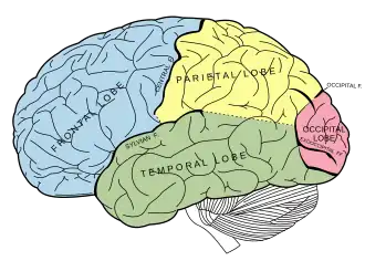 The largest portion of the brain is the cerebrum, which controls a large variety of higher functions such as abstract thought and language. It forms the outer lobes of the brain, which are discussed further bellow. Broadly speaking, this region of the brain is divided into two hemispheres, which may communicate to each other via the corpus callosum.