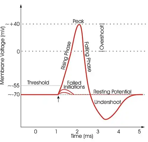 For an action potential to be generated, enough excitatory neurotransmitters must be present to raise the charge above a certain threshold level. Once this level is exceeded, an all-or-none electrical potential is sent down the length of the axon (depolarization)
