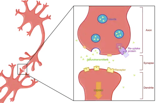 The primary class of signaling molecules are called neurotransmitters. These chemical messengers allow one neuron to communicate to another, and the response these messages generate depend on factors such as what specific type of messenger was sent, how much of it was sent, how long the message lasted, etc. Between the part of the first neuron that is sending the signal, the axon, and the second neuron that is receiving the signal, the dendrite, there exists a minute gap known as the synapse. Released neurotransmitters must cross this synapse in order to reach their specific receptors on the other side, and then are recycled or broken down after achieving their desired effects.