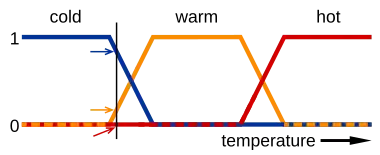 For example, in the image below the meanings of the expressions cold, warm, and hot are represented by functions mapping a temperature scale. A point on that scale has three "truth values"—one for each of the three functions. The vertical line in the image represents a particular temperature that the three arrows (truth values) gauge. Since the red arrow points to zero, this temperature may be interpreted as "not hot"; i.e. this temperature has zero membership in the fuzzy set "hot". The orange arrow (pointing at 0.2) may describe it as "slightly warm" and the blue arrow (pointing at 0.8) "fairly cold". Therefore, this temperature has 0.2 membership in the fuzzy set "warm" and 0.8 membership in the fuzzy set "cold". The degree of membership assigned for each fuzzy set is the result of fuzzification.