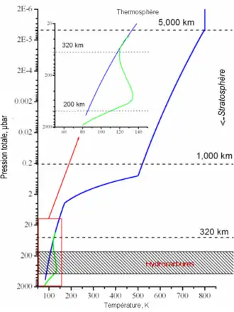 The outermost layer of the Uranian atmosphere is the thermosphere and corona, which has a uniform temperature around 800 to 850 K.[16][14] The heat sources necessary to sustain such a high value are not understood, since neither solar far UV and extreme UV radiation nor auroral activity can provide the necessary energy. The weak cooling efficiency due to the lack of hydrocarbons in the stratosphere above 0.1 mBar pressure level may contribute too.[75][14] In addition to molecular hydrogen, the thermosphere-corona contains many free hydrogen atoms. Their small mass together with the high temperatures explain why the corona extends as far as 50 000 km or two Uranian radii from the planet.[75][14] This extended corona is a unique feature of Uranus.[14] Its effects include a drag on small particles orbiting Uranus, causing a general depletion of dust in the Uranian rings.[75] The Uranian thermosphere, together with the upper part of the stratosphere, corresponds to the ionosphere of Uranus.[66] Observations show that the ionosphere occupies altitudes from 2 000 to 10 000 km.[66] The Uranian ionosphere is denser than that of either Saturn or Neptune, which may arise from the low concentration of hydrocarbons in the stratosphere.[14][77] The ionosphere is mainly sustained by solar UV radiation and its density depends on the solar activity.[78] Auroral activity is insignificant as compared to Jupiter and Saturn.[14] [15]