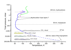 The troposphere is the lowest and densest part of the atmosphere and is characterized by a decrease in temperature with altitude.[16] The temperature falls from about 320 K at the base of the nominal troposphere at −300 km to 53 K at 50 km.[74][66] The temperatures in the coldest upper region of the troposphere (the tropopause) actually vary in the range between 49 and 57 K depending on planetary latitude.[16][27] The tropopause region is responsible for the vast majority of the planet’s thermal far infrared emissions, thus determining its effective temperature of 59.1 ± 0.3 K.[27][64]