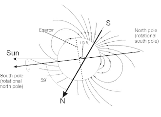 Voyager's observations revealed that the magnetic field is peculiar, both because it does not originate from the planet's geometric center, and because it is tilted at 59° from the axis of rotation.[6][7] In fact the magnetic dipole is shifted from the center of the planet towards the south rotational pole by as much as one third of the planetary radius.[6] This unusual geometry results in a highly asymmetric magnetosphere, where the magnetic field strength on the surface in the southern hemisphere can be as low as 0.1 gauss (10 µT), whereas in the northern hemisphere it can be as high as 1.1 gauss (110 µT).[6] The average field at the surface is 0.23 gauss (23 µT).[6] In comparison, the magnetic field of Earth is roughly as strong at either pole, and its "magnetic equator" is roughly parallel with its geographical equator.[7] The dipole moment of Uranus is 50 times that of Earth.[6][7] Neptune has a similarly displaced and tilted magnetic field, suggesting that this may be a common feature of ice giants.[7] One hypothesis is that, unlike the magnetic fields of the terrestrial and gas giants, which are generated within their cores, the ice giants' magnetic fields are generated by motion at relatively shallow depths, for instance, in the water–ammonia ocean.[8][9]
