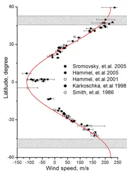 - ↑ 26.0 26.1 26.2 26.3 26.4 Hammel, H. B.; de Pater, I.; Gibbard, S. G.; Lockwood, G. W.; Rages, K. (June 2005). "Uranus in 2003: Zonal winds, banded structure, and discrete features". Icarus 175 (2): 534–45. doi:10.1016/j.icarus.2004.11.012.