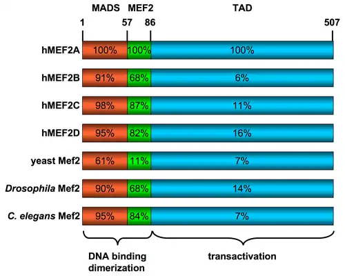 Myocyte enhancer factor-2 (MEF2) proteins are a family of transcription factors which through control of gene expression are important regulators of cellular differentiation and consequently play a critical role in embryonic development.[2] In adult organisms, Mef2 proteins mediate the stress response in some tissues.[2]