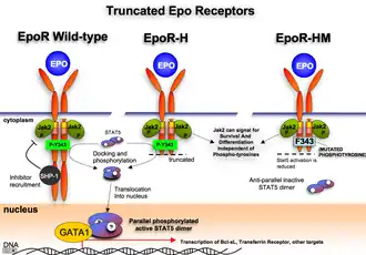 In the diagram on the right, STAT5 may be involved with an erythropoiesis receptor, or Epo Receptor. Murine, members of the subfamily Murinae, Epo Receptor truncations and known functions are included. Erythroid differentiation depends on transcriptional regulator GATA1, zinc finger DNA binding domain binds specifically to DNA consensus sequence [AT]GATA[AG] promoter elements. In erythropoiesis, EpoR is best known for inducing survival of progenitors.