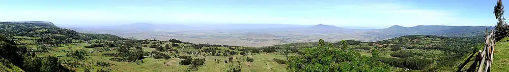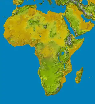 Africa, although it is among the largest of the continents, lacks large, lengthy mountain ranges that go across great distances. Instead, Africa is largely dominated by flatter land, often in the savanna, the tropical rainforests, and the Sahara Desert. The main exceptions are the Atlas Mountains in Morocco, the varied terrain going south from Ethiopia on Africa's eastern side (including the rift valley and Mt. Kilimanjaro), and the mountain ranges in South Africa.