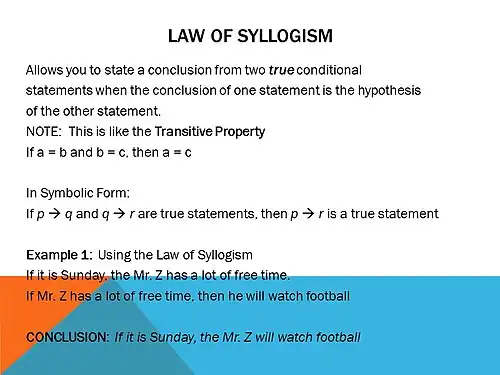 The Law of Syllogism is another law of logic and is similar to the Transitive Property. This law, like the Law of Detachment, has a specific format to it.
