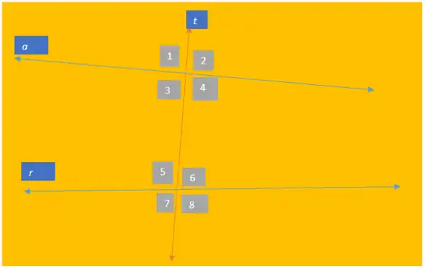 - Transversal lines intersect two or more coplanar lines in different points. (Line t intersects lines a and r)