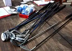 The conventional set of golf clubs includes a driver, a 3-wood, a 5-wood, irons ranging from a 2-iron to a 9-iron, a pitching wedge, a sand wedge, and a putter. Modern variant sets typically replace the 5-wood and 2-iron with a hybrid or rescue club and a lob wedge. Each club in the set is designed to send the ball over successive ranges. The driver typically is used to send the ball 240-260 yards, and many professional players average 280 yards per drive. Each successive club in a set from driver to putter is shorter in length and sends the ball a shorter distance, with the idea that the various distances called for during the round can be played with a appropriate club without much adjustment from its customary range.